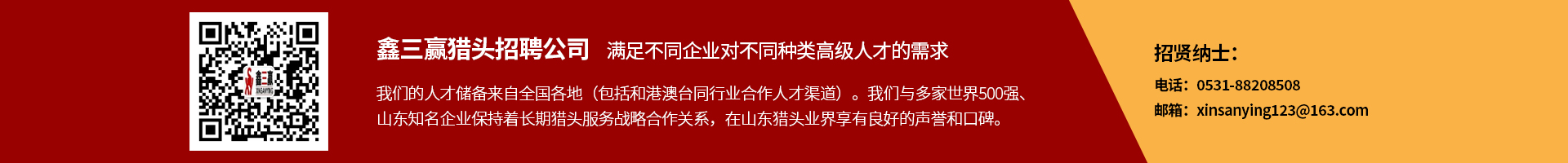 鑫三贏獵頭招聘公司(0531-88208508)是山東本土的知名專業(yè)獵頭招聘公司,幫助企業(yè)解決中高端招聘難題 ,免費(fèi)幫助人才推薦更好的工作機(jī)會(huì)。公司總部位于山東省省會(huì)濟(jì)南市。我們致力服務(wù)于山東省內(nèi)大中型內(nèi)外資企業(yè),我們通過對(duì)客戶企業(yè)的組織結(jié)構(gòu)、相關(guān)業(yè)務(wù)和具體職位的研究、分析,能夠很好的與企業(yè)及候選人進(jìn)行溝通,滿足不同企業(yè)對(duì)不同種類高級(jí)人才的需求,我們的人才儲(chǔ)備來自全國各地(包括和港澳臺(tái)同行業(yè)合作人才渠道)。我們與多家世界500強(qiáng)、山東知名企業(yè)保持著長期獵頭服務(wù)戰(zhàn)略合作關(guān)系,在山東獵頭業(yè)界享有良好的聲譽(yù)和口碑。
